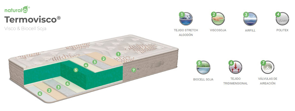 El acolchado del colchón Naturalia Termovisco incluye: viscoelástica con soja, fibras Airfill, una plancha de poliuretano. Está tapizado en tejido Strech de algodón. Es un colchón que ofrece adaptabilidad, se adapta al cuerpo del durmiente sin producir presiones. Su altura total es de 27 cm.
