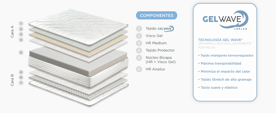 Las capas del colchón Fresh Wave de Relax se pueden ver en la siguiente imagen. En la cara superior encontramos: viscoelástica con partículas de gel para disipar el calor y espumación HR Medium para aportar confort al descanso. La inferior cuenta con una capa de espumación AIrPlus para mejorar la ventilación interior.