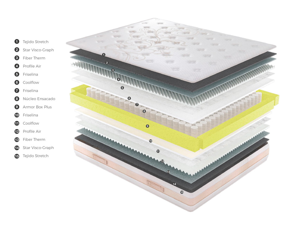 Las capas, que acompañan al núcleo del colchón y que dotan a éste de adaptabilidad, son los acolchados. Estas capas están compuestas de materiales diferentes en cada uno de estos modelos. El colchón de nuestra marca propia sí cuenta con viscoelástica en el acolchado, el Sealy no contiene este material que se caracteriza por acoger el cuerpo sin presiones.
