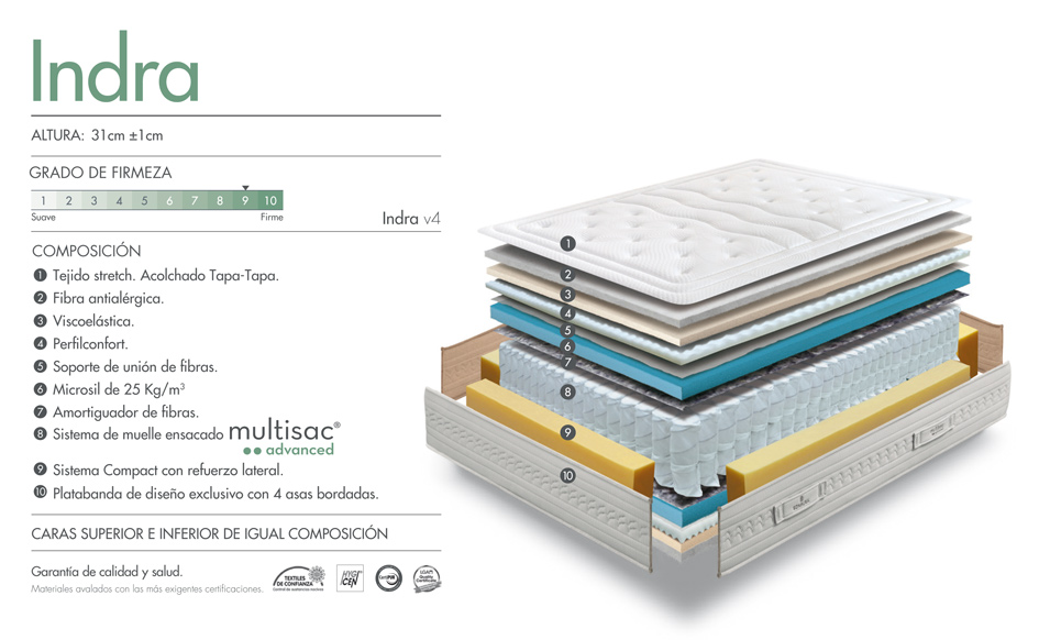 El acolchado del Indra Sonpura dispone en varias caras del colchón de diversas capas: 1 cm de viscoelástica, 3 cm de espumación Microsil y una capa de fibras hipoalergénicas. Es un colchón adaptable y fresco. Ofrece además efecto masaje al descanso, gracias a su acolchado con sistema Perfil Confort. También destaca por su profundidad (31 cm de grosor) que permite un descanso confortable para las personas que duermen de lado.
