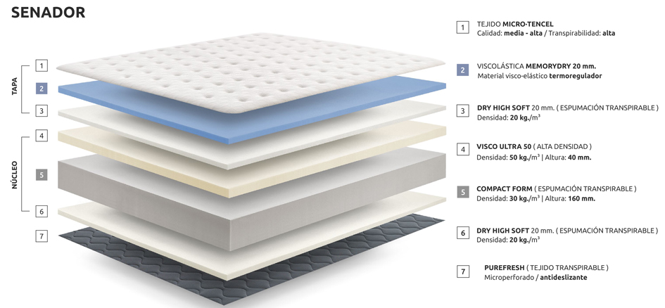 Los acolchados del Senador de Colchones.es tiene distintos componentes en ambas caras. La cara inferior dispone de 2 cm de espumación transpirable Dry High Soft y está tapizada en tejido de malla 3D Pure Fresh. Si se duerme directamente sobre esta capa se obtiene un descanso más firme y fresco. La otra cara cuenta con: 4 cm de viscoelástica de 50kg/m3 de densidad, 2 cm de espumación Dry High Soft, 2 cm de viscoelástica Memory Dry y está tapizada en tejido transpirable Micro Tencel.