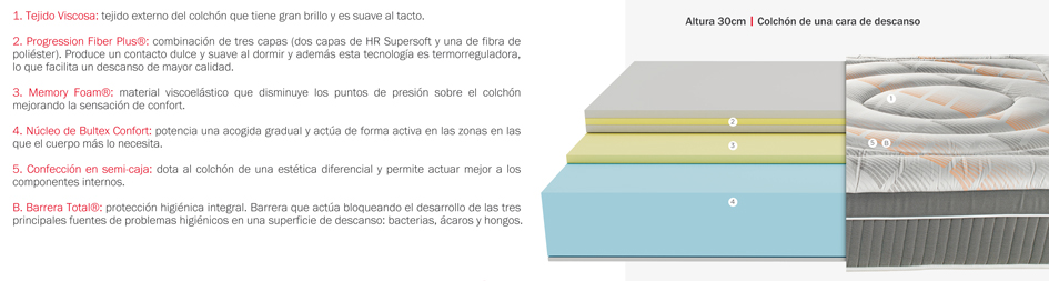 Las capas que acompañan al doble núcleo Bultex en el colchón Quasar se componen de: espumación Memory Foam para una adaptabilidad ergonómica y Progression Fiber Plus para un confort y transpirabilidad superior. El tapizado en tejido Strech. En la imagen siguiente se muestra la composición del colchón Quasar de Bultex.