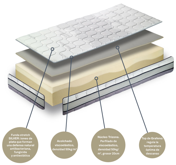 En el caso del colchón Tempur Original Elite la viscoelástica es CoolTouch y en el modelo de Hukla es un topper de viscoelástica de 1 cm con partículas de grafeno que se suma a una capa de entre 4-7 cm de viscoelástica de 50 kg/m3 de densidad.