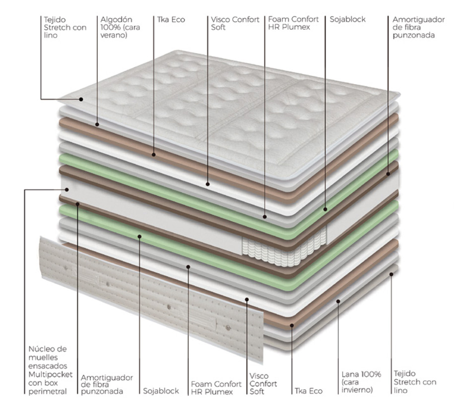 Los otros componentes del relleno sí son iguales. Encontramos: espumación soja block que aporta suavidad y transpirabilidad y se adapta al cuerpo, viscoelástica Confort Soft que se adapta en función de la temperatura y espumación HR Plumex Soft para una acogida agradable.