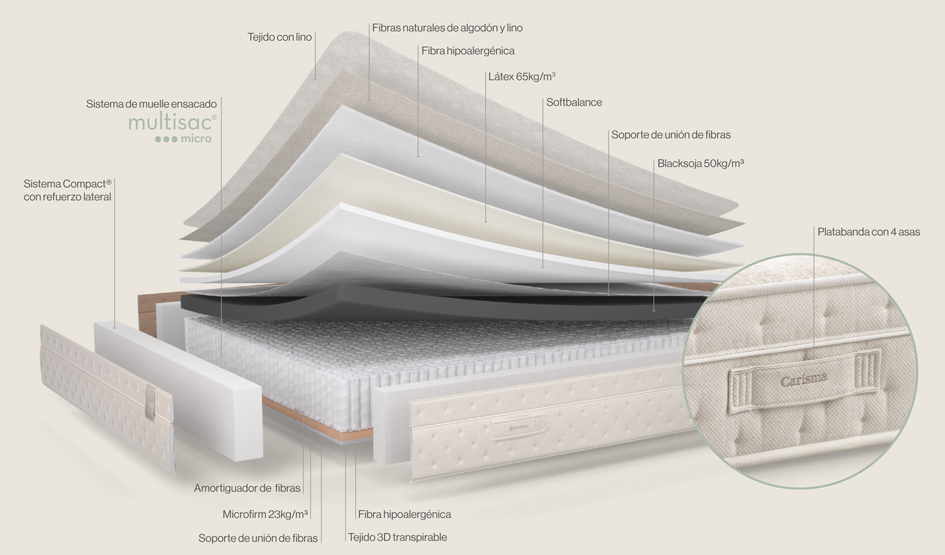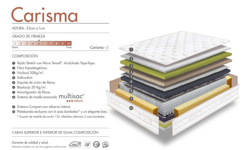 El colchón Carisma comparte el mismo núcleo del Royal. Son muelles ensacados Multisac Micro (1.800 en la medida de 150×190 cm). Pero el grueso del alambre es menor, de ahí que también tenga una menor firmeza. Es un colchón de firmeza medio blanda, de 3 sobre 6. Con esta firmeza no se recomienda para deportistas como en el caso del Royal.