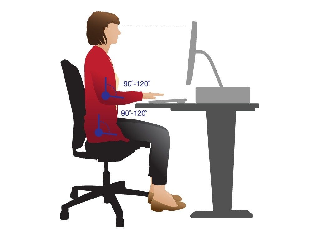 En la imagen siguiente puedes ver la mejor forma de sentarte delante del ordenador. Es la postura más respetuosa con tu espalda. Además, de sentarte bien, es conveniente que cada poco tiempo te levantes, des un paseo corto, hagas estiramientos. Todo suma para evitar dolores musculares.