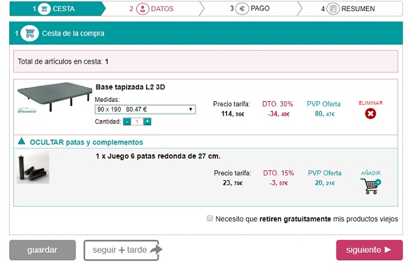 Si adquirís vuestra base tapizada en la tienda online de Colchones.es debes tener en cuenta que en la gran mayoría de los modelos, las patas no van incluidas debes añadirlas durante el proceso de compra. Para añadirlas a la cesta es muy sencillo. Como vemos en la imagen siguiente de la cesta de la compra de la base tapizada L2 3D de la marca propia Colchones.es debes elegir las patas y añadirlas en la cesta. En algunos modelos te daremos varias patas sueltas de base tapizada a elegir.