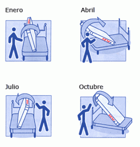 Además de limpiar el colchón y protegerlo con una funda es importante evitar que los acolchados se apelmacen y que siempre sufra la misma zona del colchón el peso del durmiente. En este caso debemos girar el colchón de pies a cabeza cada dos o tres meses y también lo voltearemos de arriba a abajo, si el colchón cuenta con capas de acolchado en ambas caras. Lo voltearemos dos o tres veces al año.