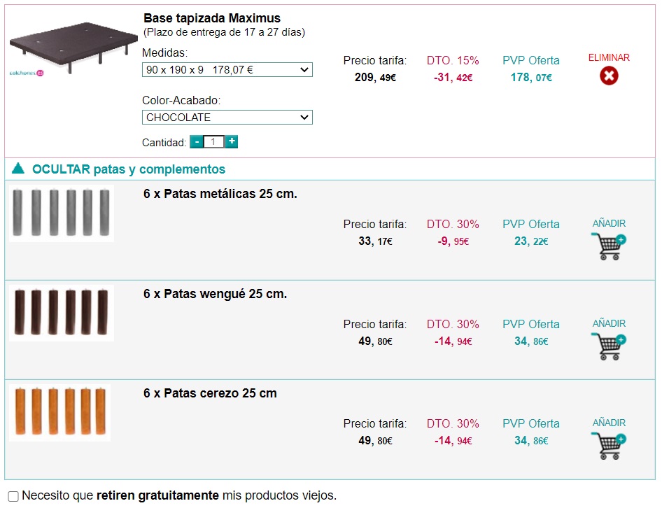 Cuando tengas claro el modelo de base que quieres y la incluyas en la cesta de la compra, verás en la pestaña de Complementos de la misma, las opciones de patas disponibles y compatibles con esta base. Elige las que más te gusten y añádelas a tu pedido.