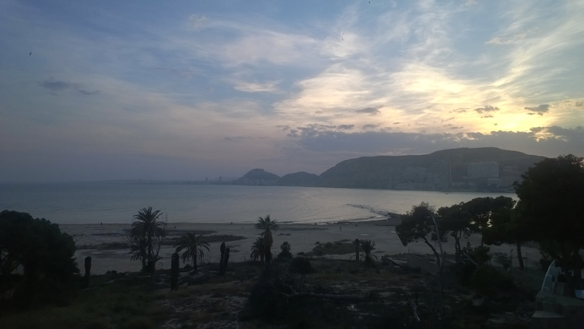 Mi dormitorio actual es lo más parecido que puedo tener al que me gustaría. Es blanco, la cama es el foco principal de atención, grande y con un cálido nórdico gris claro, haciendo contraste con la tarima oscura que viste el suelo, y un enorme ventanal que deja pasar mucha luz y me permite ver la playa de la costa alicantina. Os muestro una imagen de la vista. Muy muy sencillo, tal como me gustan las cosas.