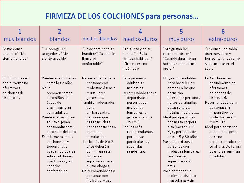En la tabla que os he preparado, podemos ver la relación firmeza con el tipo de durmiente indicado: