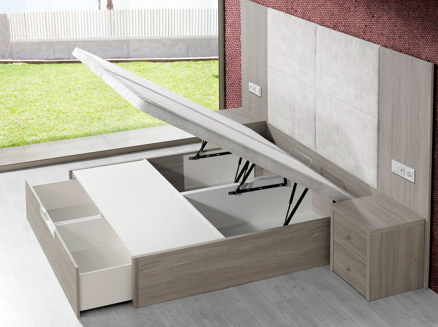 Hay varias opciones de acabados y colores para adaptarlo a la decoración del dormitorio. Y se pueden añadir varios extras: tapa partida, embellecedor, aireadores en la tapa, doble bisagra, zócalo, apertura con motor, patas, sistema anti desplazamiento.