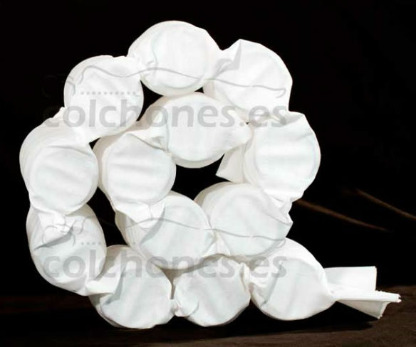 La diferencia fundamental entre estos dos tipos de colchones, los de muelles de hilo continuo y los de muelles ensacados, es que estos últimos, como su nombre indica, tienen los muelles distribuidos en pequeños sacos colocados en su interior. Tal y como se muestra en la imagen siguiente.