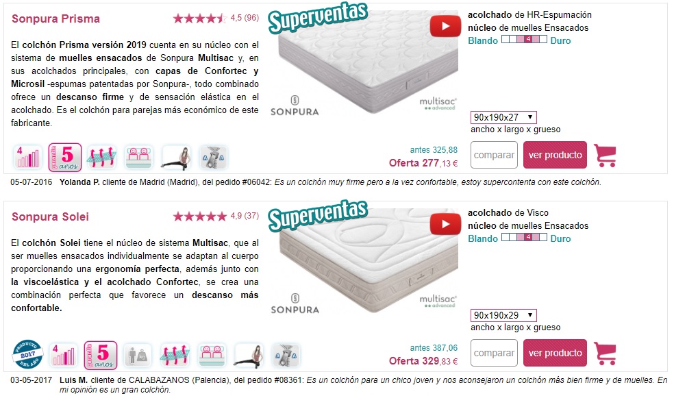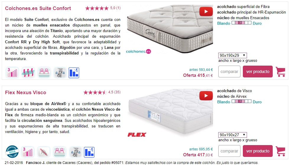 En la imagen de abajo vemos algunos ejemplos de colchones de lechos independientes de firmeza 3, media-baja: