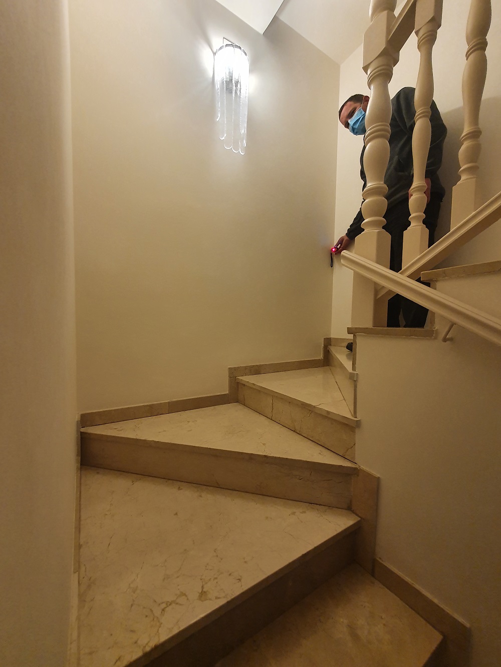 En la foto estamos midiendo, desde el visor de la cámara con la que hacemos la foto hasta el puntero laser, salvando el pasamanos de la escalera (que dejamos a la derecha). Esta distancia será la máxima que nos permitirá la escalera para hacer el giro. Si es más corta que la diagonal del objeto, no podrá subir con seguridad.