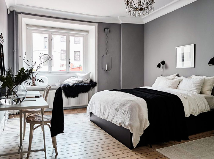 Otra opción es cubrir tu cama con ropa de cama de color blanco o clara y situar cojines negros encima de la cama o a la inversa como vemos en la foto anterior. Como tú prefieras. Así conseguirás tu habitación con decoración black and white.