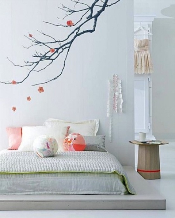 En la imagen podemos ver un dormitorio en blanco con un dulce y elegante vinilo sobre el cabecero, en forma de ramas negras y flores rojas, que nos recuerda a los campos de cerezos en flor o quizás una delicada pintura oriental.