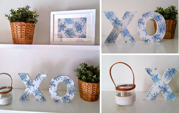 Algo también muy común en el mundo DIY es crear adornos y detalles característicos para colocar en cómodas, estanterías y mesillas de noche. Y para muestra, un botón. Tan sólo utilizando unas letras, un poco de líquido decoupage y unos dibujos de algas en azul, en esta estantería de Ayuda a decorar han creado un detalle muy natural en azul y con un toque muy mediterráneo.