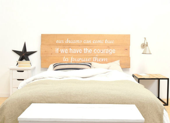 Una de las tendencias más comunes para el dormitorio es colocar, por ejemplo, un cabecero de madera. Tiene que tener un aspecto informal y lo mejor es que podemos pintarlo del color que queramos, además de poner la frase o dibujo que más nos guste. Esta foto de Kenay Home nos encanta.