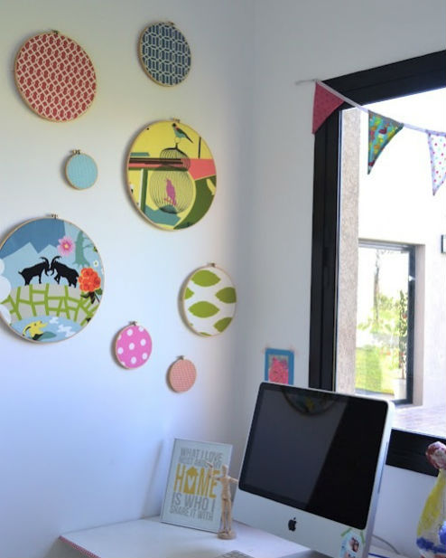 ¿Sabes qué son los bastidores? Se trata de esos soportes redondos de madera que tantas se utilizan para bordar. Sólo que en este caso, en lugar de bordar, le pegamos una tela encima con el diseño que queramos, procurando que quede bien tensada y cortando lo que sobra. Podemos hacer unos cuantos y colgarlos luego en la pared de nuestra habitación.