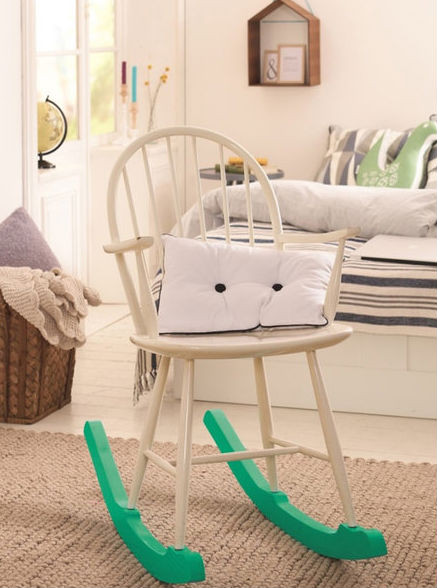 Nos encanta por ejemplo lo que han hecho con esta silla de madera en Mi Casa Revista. La han transformado en una mecedora con patas verdes muy original. Y además es muy fácil de hacer. Mira qué efecto hace tan coqueto en el dormitorio.