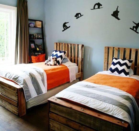 A modo de cabecero, o de cama, los palets pueden ser de gran ayuda. Si eres manitas puedes pintarles algo o ponerles pequeños vinilos a gusto del durmiente.