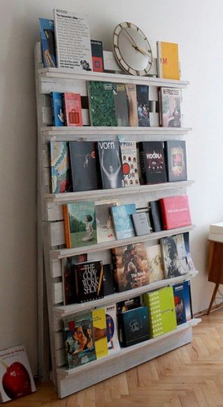 Y si queremos seguir ordenando, pintando un palet del color que deseemos, en este caso blanco, podemos tener una práctica estantería donde tener nuestros libros a mano.