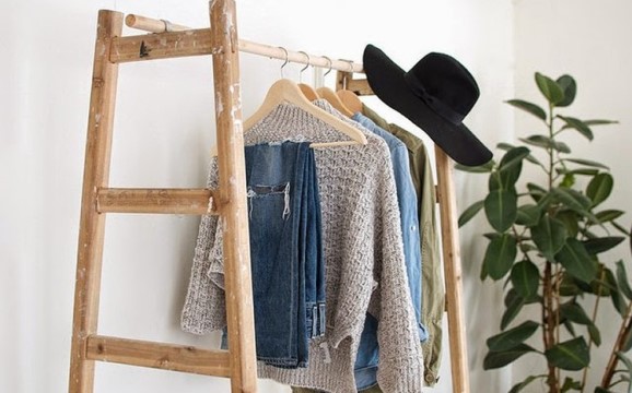Pero si lo que necesitas es tener ordenada tu ropa, qué mejor que crear tu propio «armario» o «burro» para colgar tus perchas. En el blog espaciodeco encontramos esta original idea creada con una escalera y un palo.
