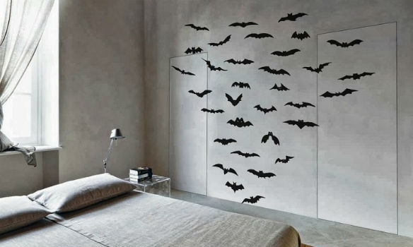 Puedes simplemente darle un toque sencillo y minimalista, como puedes ver en esta fotografía de Deccoración, donde han decorado la pared con una serie de pequeños murciélagos negros de vinilo. Encajan muy bien y le dan un aire muy misterioso y al mismo tiempo elegante al dormitorio.