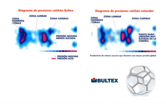 Los colchones Bultex se caracterizan por varios elementos fundamentales: el confort que genera, su adaptabilidad progresiva, la alta independencia de lechos y la dispersión del calor. En el diagrama de presiones de los colchones Bultex frente a los modelos estándar, nos fijamos en que tiene una presión máxima menos elevada en la zona de la cadera, como puedes ver en la imagen, lo que repercute en el confort del durmiente.
