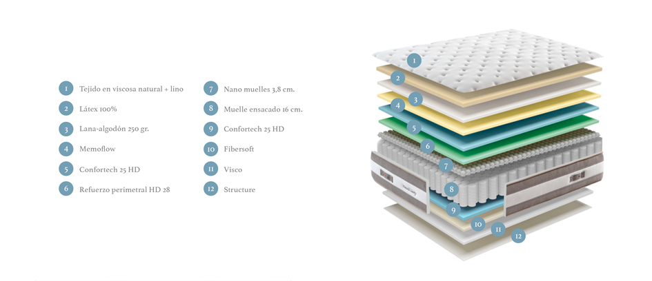 Está formado por un núcleo con dos bloques. Un bloque de 16 cm de altura de muelles ensacados y otro de nano muelles de 3,8 cm de altura. Con ello se consigue una mayor adaptabilidad y mayor independencia de lechos.