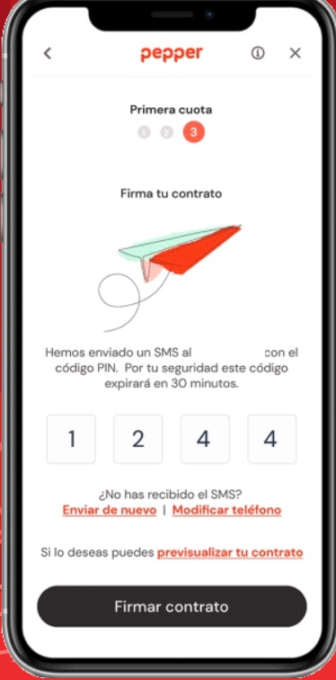 El último paso de la solicitud de financiación con PEPPER es la firma con tu móvil como puedes ver en la imagen siguiente. Te envían un código de verificación y firmas a través del móvil.