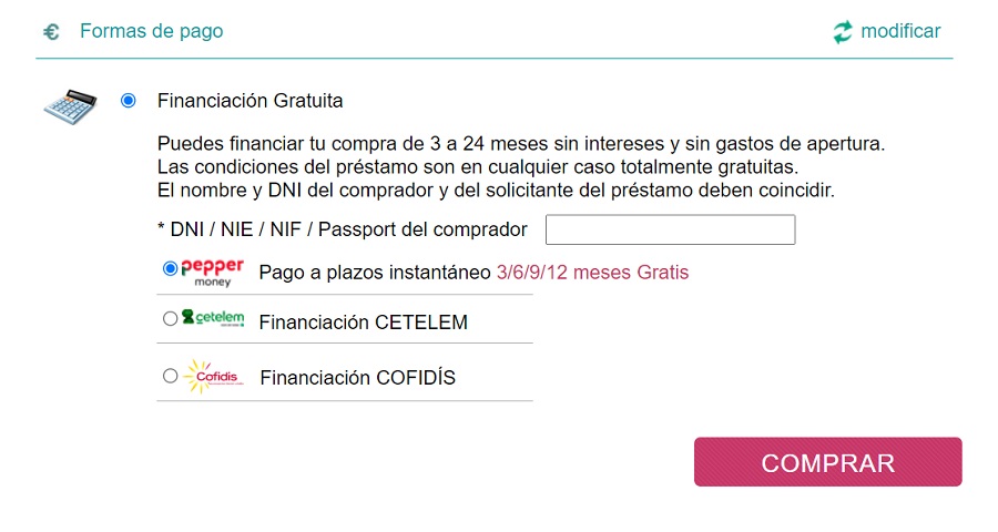 Si eliges pagar en 3, 6, 9 o 12 meses, la financiación es totalmente gratuita. No pagas comisiones ni intereses.
