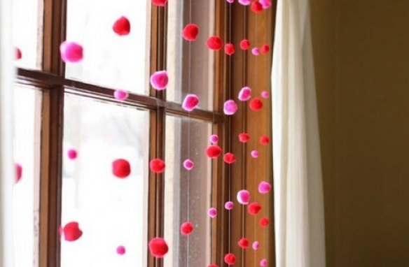 El corazón es una vez más el icono decorativo esencial. En estas imágenes de Decovanguardia vemos varias formas de utilizarlos. En la primera foto combinan cortinas de tanza con pompones. En la segunda han sido muy originales y han utilizado una guirnalda ecológica que transfiere una gran belleza y naturalidad a la ventana, aparte de resguardarnos de las luces de la calle.