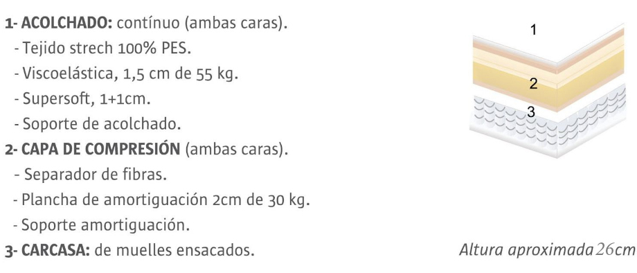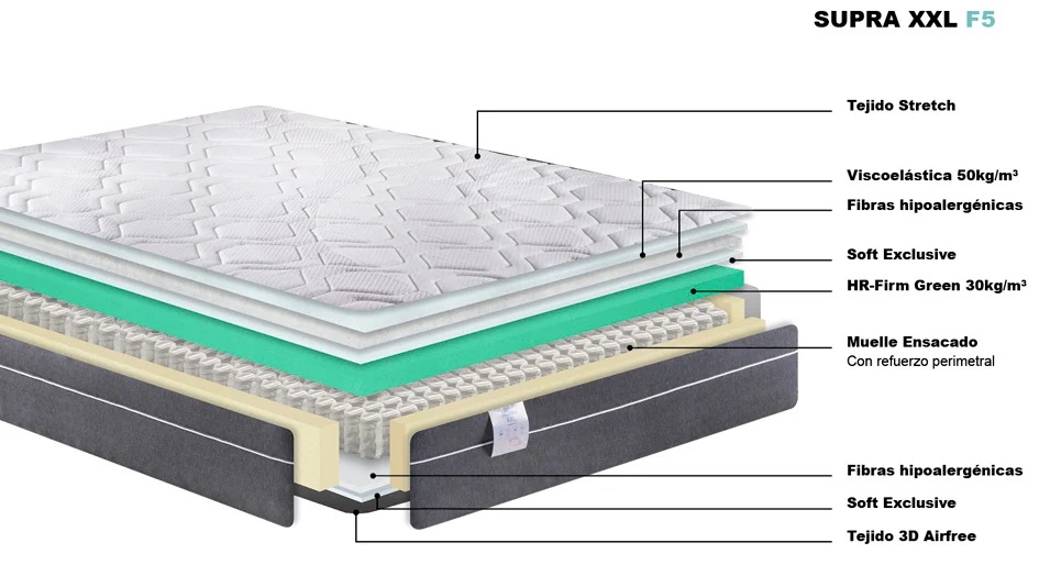 En la tienda online Colchones.es informamos a nuestros clientes de todas las capas de acolchado y su distribución en la ficha de cada producto. En la pestaña Ver por dentro se puede apreciar todas las partes de ese modelo concreto. Lo vemos en este corte transversal de nuestro colchón de marca propia Supra XXL duro de Colchones.es.