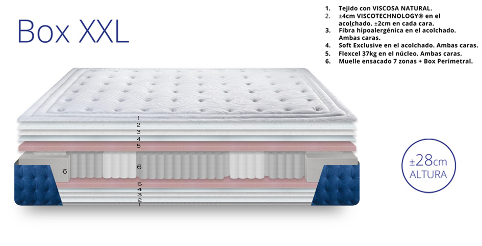 El acolchado del Box XXL destaca por su gran calidad y materiales con las tecnologías más avanzadas del mercado. En ambas caras del colchón encontramos 2 cm de viscoelástica ViscoTechnology que contiene partículas de gel (aportan frescor), carbono (evita bacterias y elimina la electricidad estática) y grafeno (aporta confort térmico).
