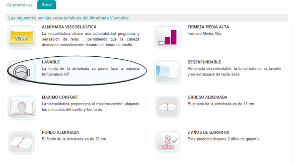 A la hora de lavar la funda es muy importante ver las instrucciones de limpieza que aparecen en la etiqueta. En nuestra web de Colchones.es esta información está disponible en cada familia de producto -imagen anterior- y la ampliamos en la ficha de las almohadas como puedes observar en la siguiente captura de pantalla perteneciente a la almohada Belnou Viscoplus.