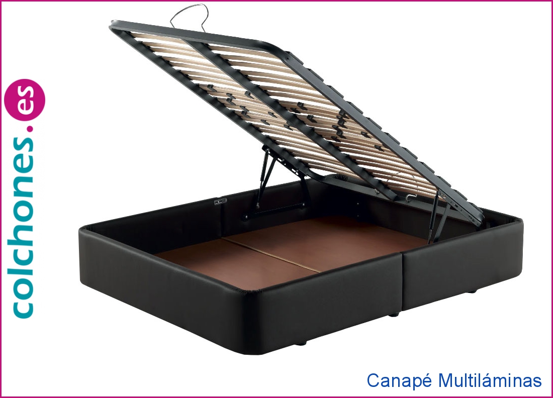 Cuando el somier presenta distintos planos sobre los que apoyará el colchón, se denominará «somier articulable». Lo que no es tan conocido es que también existen canapés abatibles cuya tapa es un somier de láminas como el Canapé Multiláminas de Descansor (cuando lo habitual es una base tapizada), lo que resulta fundamental para la transpiración si el colchón es de látex, espumación o HR. Este canapé, además, se caracteriza por tener una gran resistencia y capacidad interior, y porque está tapizado en polipiel. Lo podéis ver aquí abajo:
