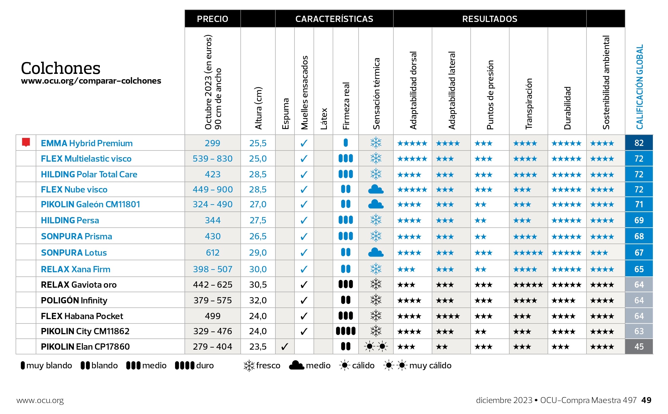 Listado colchones OCU 2024 a la venta en Colchones.es