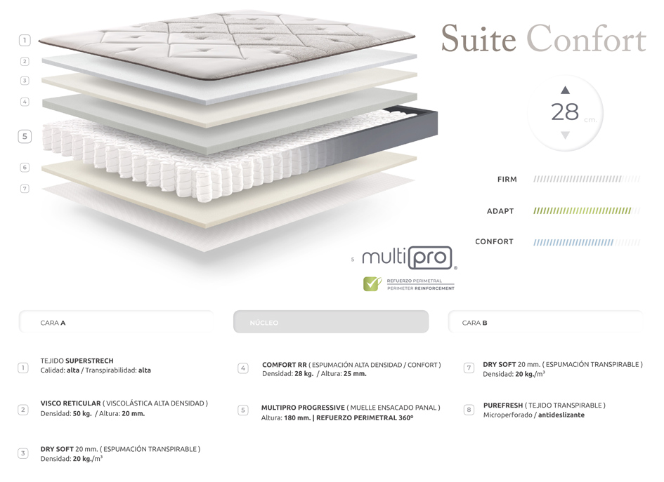 Este colchón Suite Confort está acolchado en ambas caras con Viscoelástica de 50 Kg/m3 de densidad y espumación Dry Soft, que aportan al colchón la adaptabilidad y transpirabilidad necesarias para un descanso óptimo.