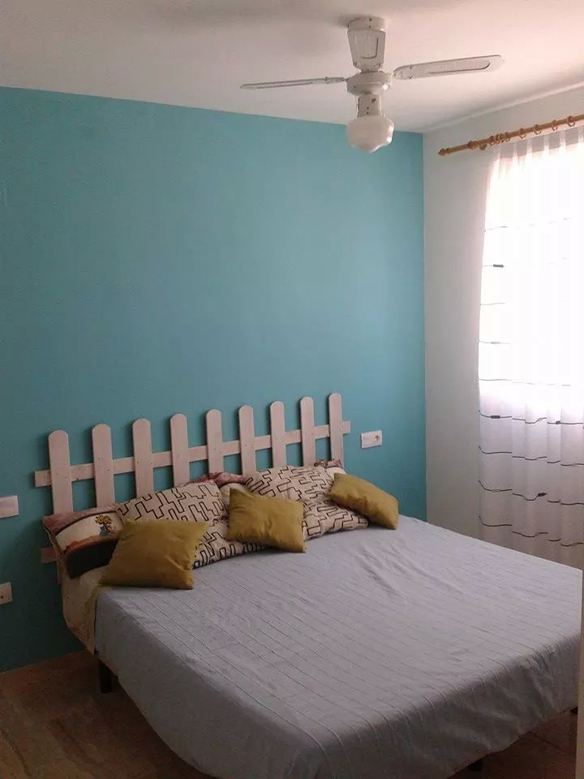 Mi habitación está decorada en tonos blancos y turquesas con un toque craft: hicimos el cabecero utilizando una valla de madera teñida de blanco. Os dejo una foto de él.