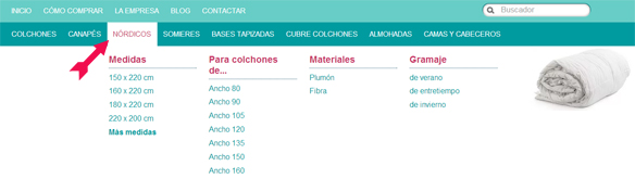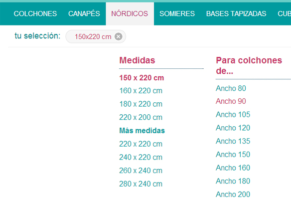 Puedes encontrar toda la información en la página principal de colchones.es Haz clic en la pestaña de «Nórdicos» y se desplegarán las medidas disponibles. Si pinchas sobre la familia nórdicos, te aparecerá un menú en la parte izquierda, donde podrás filtrar según las características que necesites: