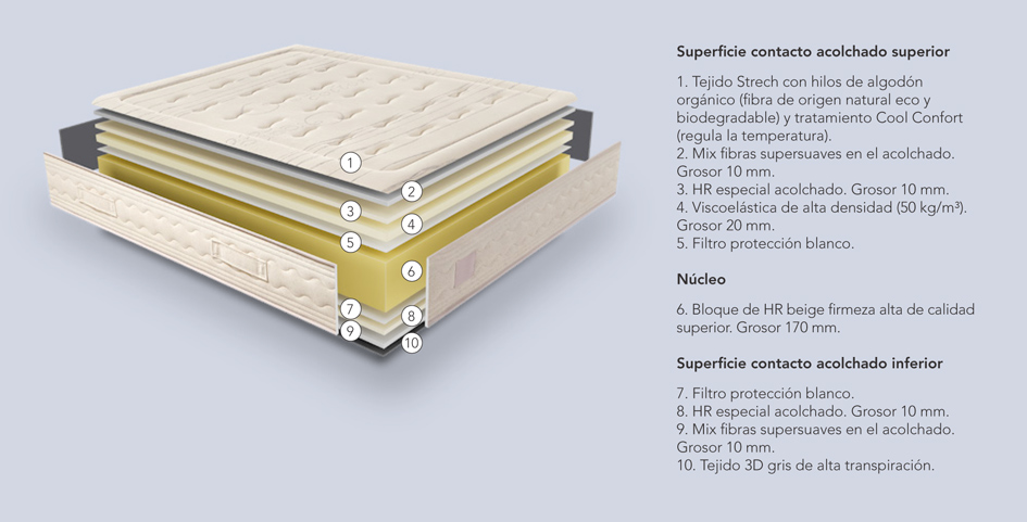 El núcleo se acompaña en la cara superior, sobre la que dormimos, de una serie de capas de acolchado: 6 cm de viscosoja, 2 cm de viscoelástica de 60 kg/m3 de densidad, doble capa de espumación HR supersoft. Es un colchón que acoge el cuerpo sin producir presión. Facilita la circulación sanguínea. Tiene gran acogida y suavidad.