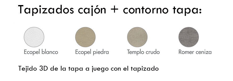 Tanto el perímetro de la tapa como el del cajón se pueden elegir en cuatro colores diferentes. Y se puede optar por contorno tapizado en tela o en polipiel para un toque de elegancia.