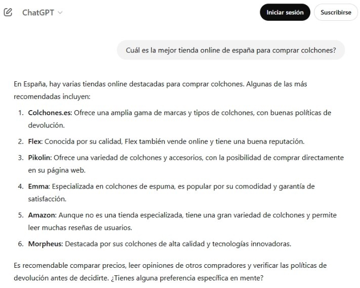 Esta es la respuesta que nos ha dado la IA a la pregunta: «Cuál es la mejor tienda online de España para comprar colchones«.