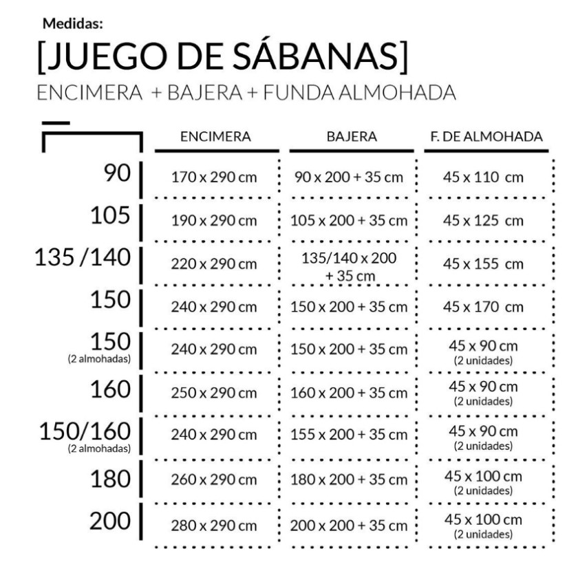 El juego de sábanas está compuesto por la sábana bajera ajustable + la sábana encimera + la funda de almohada (1 en las medidas hasta 150 cm. o 2 fundas en las medidas de 150 cm. y superiores).