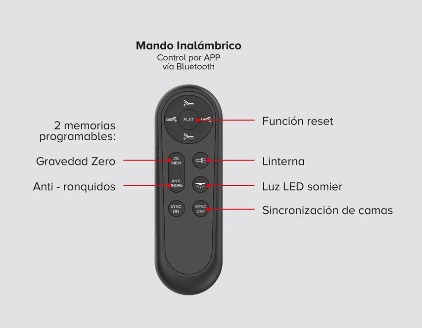 Cuenta con control por APP vía Bluetooth, mando inalámbrico, función antironquidos, posición gravedad cero, luz LED integrada y memorias programables para que encuentres siempre tu postura ideal.