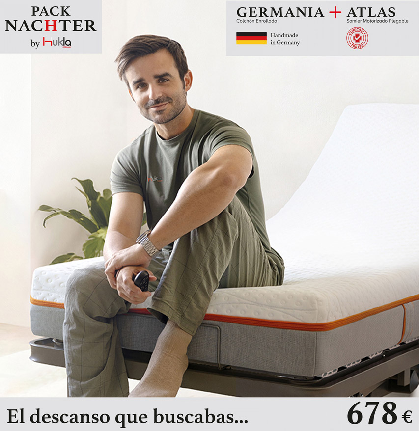 ¡Te presentamos el Pack NACHTER de Hukla! Conjunto articulado formado por el colchón Germania, con núcleo de HR , acolchado con Viscoelástica y funda desenfundable y lavable a 30 °C; y el somier plegable Atlas, con motor de 6.500N, 4 planos de articulación y mando inalámbrico. Dos productos fabricados con los más altos estándares de calidad y pensados para ofrecer el descanso perfecto.