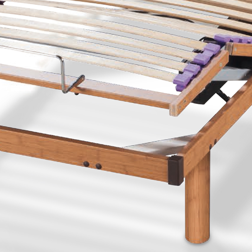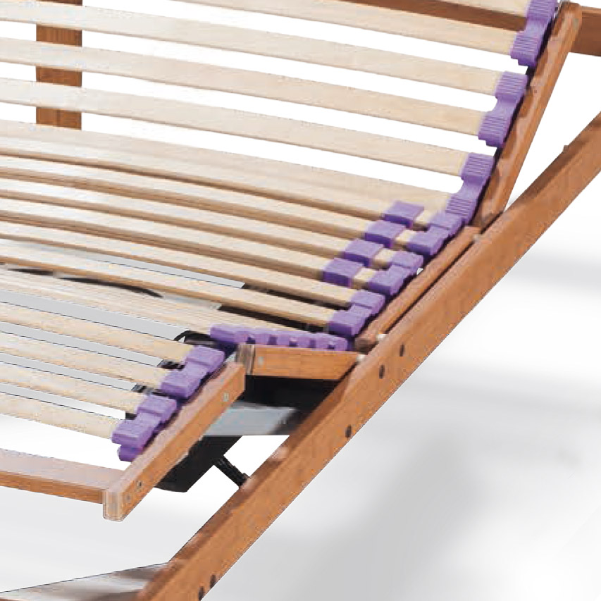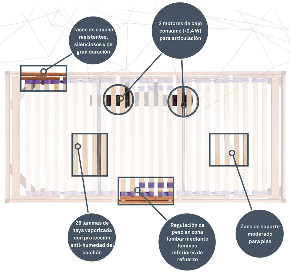 Somier articulado con dos motores de bajo consumo, 26 láminas de haya vaporizada con protección antihumedad del colchón. Bastidor de 60 x 20 mm. Regulación de peso en zona lumbar mediante láminas inferiores de refuerzoTacos de caucho, resistentes, silenciosos y de gran duración. Este somier está diseñado para un peso máximo de 120 Kg.