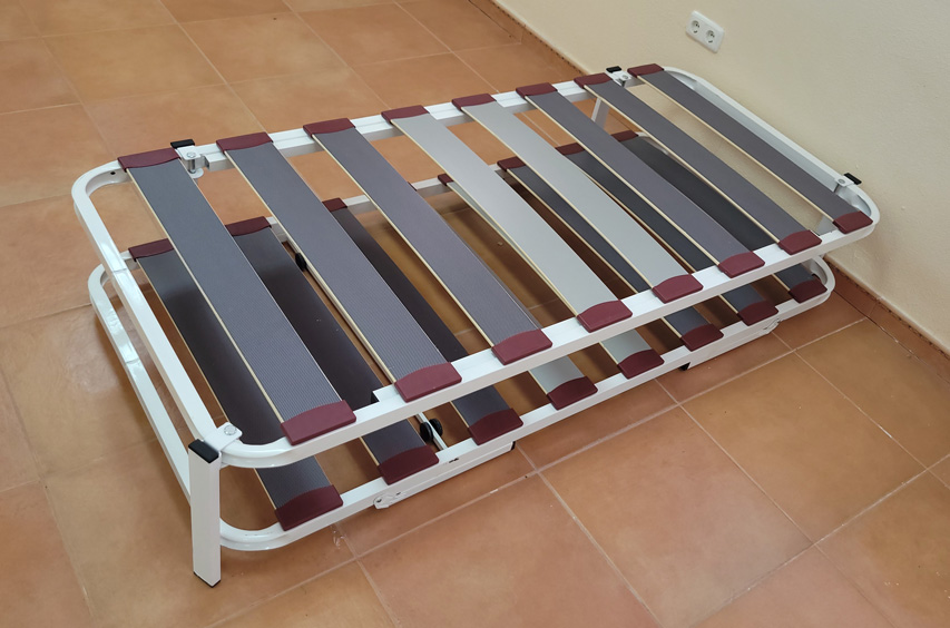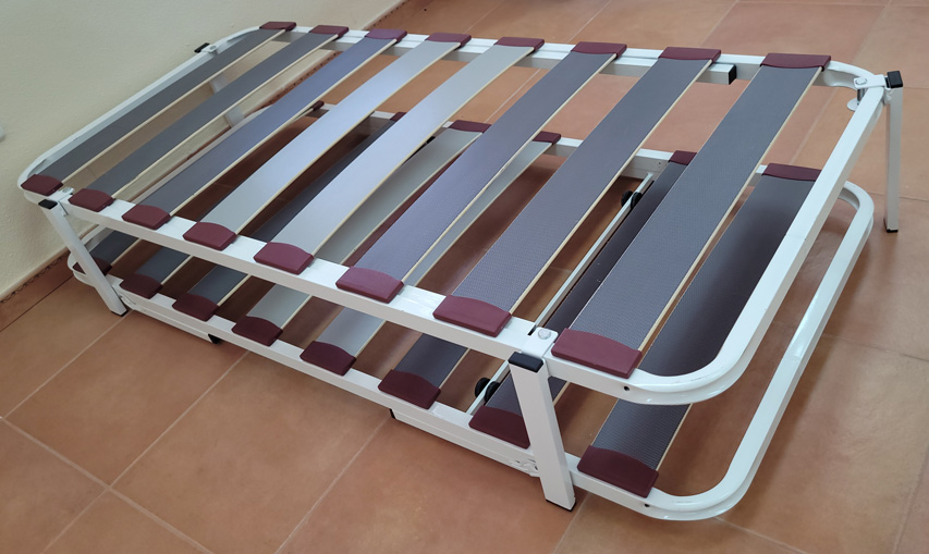 Cuando se despliega el somier inferior y se posiciona junto al superior, quedan a la misma altura. Además, es de toda garantía. Sus láminas son de madera de haya vaporizada y antideslizante, y el bastidor de acero.